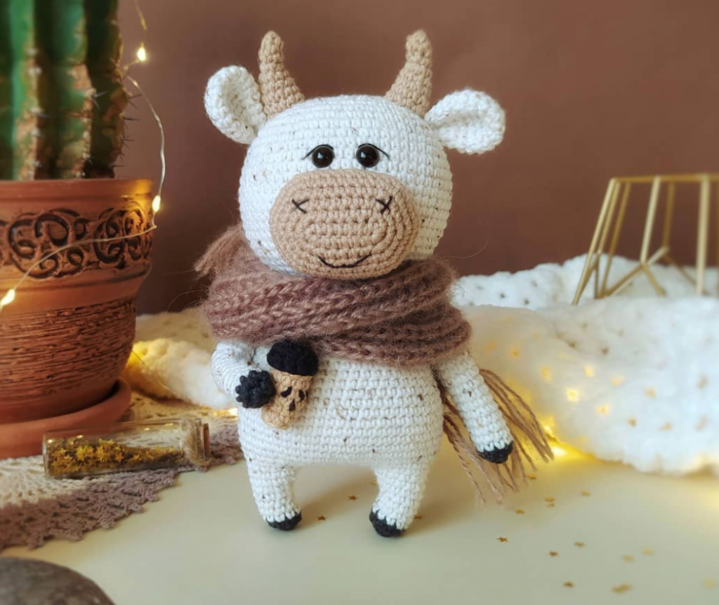 Willy the bull wearing a cozy scarf keeps warm with a cup of hot aromatic coffee. Learn how to make this cute bull using the easy to follow free amigurumi pattern. Finished toy measures approximately 18 cm (7β³) tall.