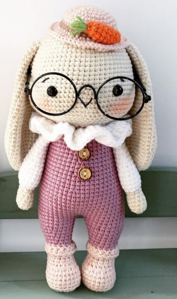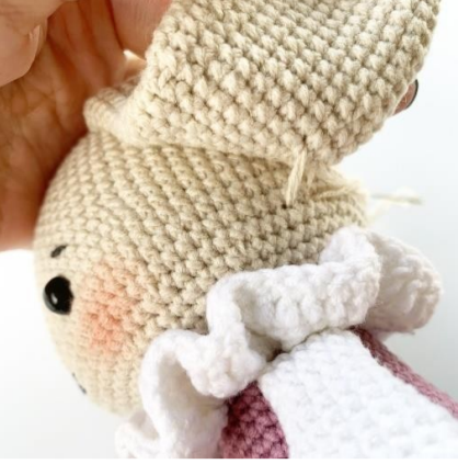 Rnd 31. (3sc, dec)8 (32) Fasten off, leave a long tail for sewing. Insert the eyes in between Rnd 21 and Rnd 22, with 15 stitches apart. Stuff the head with fiberfill. Ear: (Make 2) Rnd 1. MR 6sc (6) Rnd 2. 6inc (12) Rnd 3. 12sc Rnd 4. (sc, inc)6 (18)