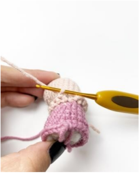 Make the second leg but do not cut yarn - Shoes: crochet into FLO of Rnd 15