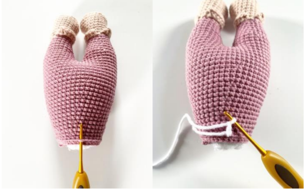 Rnd 22. 8sc, 2ch (second leg), indicate the middle stitch of the first leg, 24sc (first