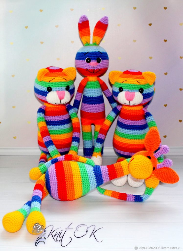 We begin to change the thread from the 5th row. We knit 3 rows with each color. The last color change occurs on the 23rd row. With this color we knit a row, then with this color we finish the last two rows of the body.