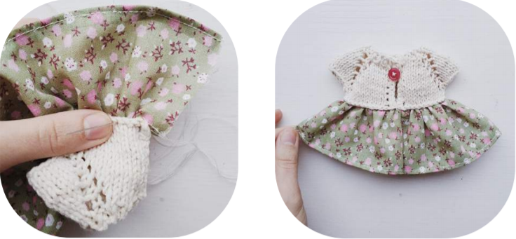 Secure finished skirt with pins to knitted top of the dress and neatly sew it with appropriate