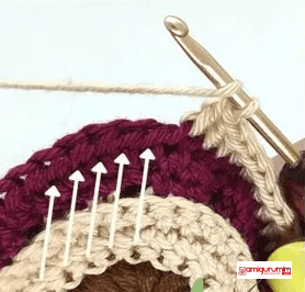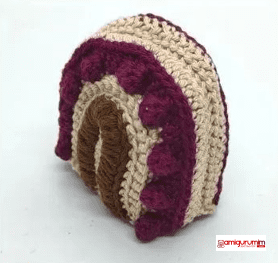 Cut the thread and sew up all threads. After crocheting both parts, leave a long thread (50cm) for sewing. In this picture you can see the described bridge from round 8.