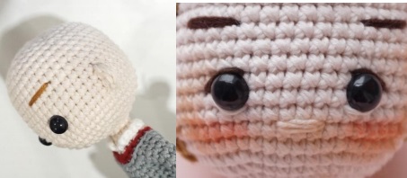 Start stuffing the head and add safety eyes between Rnd 47 and Rnd 48. The space between two holes that you put safety eyes is 8 stitches and the space between two eyes is 6 stitches.