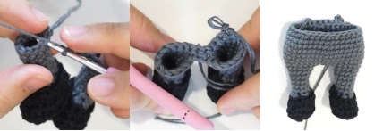 Rnd 14: join two legs into one piece: 8 sc, chain 3, sc in 2nd stitch in Rnd 13 of right leg, 11 sc on right leg, 3 sc on the chain, 4 sc on left leg (30)
