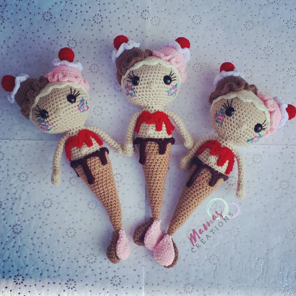 The pattern will be very different depending on what yarn and hook you use as well as stuffing preferences… But I chain to the desired length and add SC or HDC rows to desired length. I did 4. Then sew it up! Then I use a piece of yarn and connect it to the middle front and tie in the back like an actual swim suit top!Now you need to add some hair!