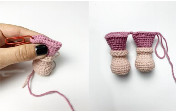 Make the second leg but do not cut yarn - Shoes: crochet into FLO of Rnd 15