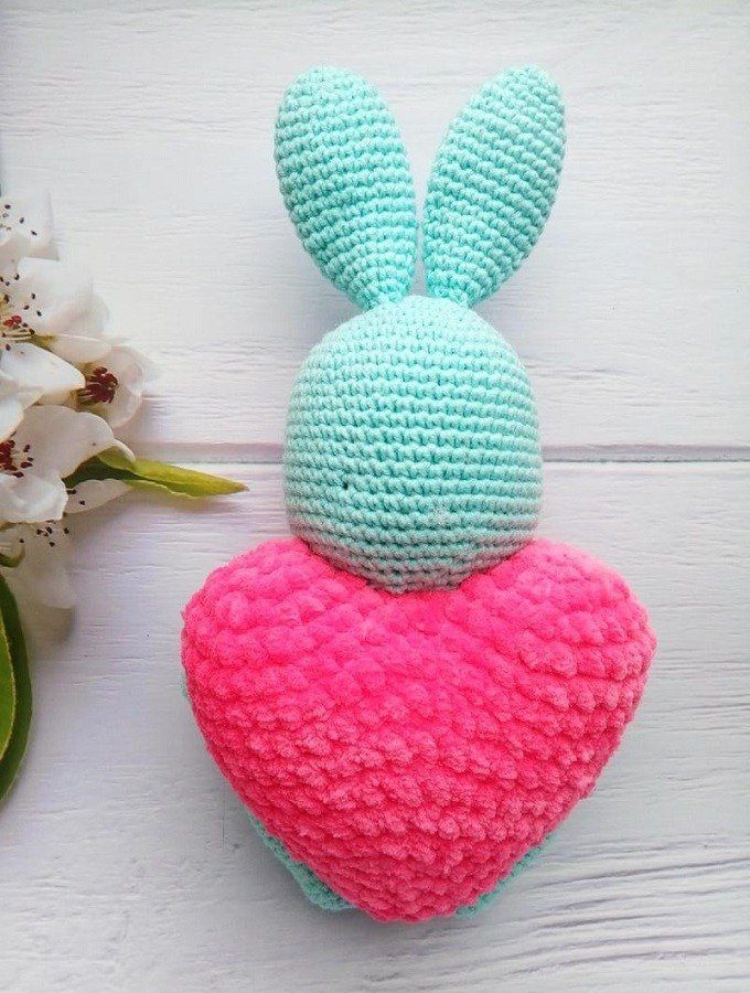 Valentine’s day is a time to make something crochet for those you love. Use this free amigurumi pattern to create a cute bunny holding a heart. The height of the finished bunny with a heart is about 21 cm (8.2″).